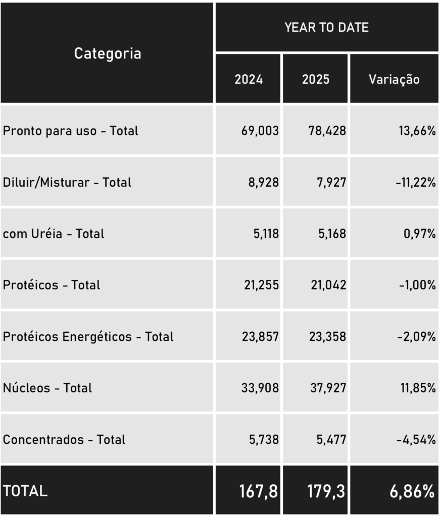 Este panorama vem reverberando de imediato na comercialização de suplementos minerais das empresas ligadas à ASBRAM, que representam mais de 70% do mercado, pelas fazendas brasileiras produtoras de carne e leite, desde a metade do ano passado. O setor fechou 2024 comercializando 2.577.619 milhões de toneladas, 6,74% acima de 2023, o segundo melhor ano em volume na história, com destaque para a categoria ‘pronto para uso’, com 935,4 mil toneladas, e 71 milhões de cabeças suplementadas. E um movimento interessante para a categoria leite, novamente subindo na casa dos dois dígitos. “E, apesar de um recuo em dezembro, as vendas voltaram a se fortalecer em janeiro. 179.328 mil toneladas, entregues. Vide tabela abaixo, onde o mês de janeiro de 2025, é comparado ao de 2024: